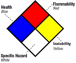 The NFPA/NFR labeling systems employ a color-coded rating guide in a diamond shape. Health is defined by the color blue, flammability is red and instability is represented in yellow. The numbers 0–4 are assigned according to the level of hazard the chemical(s) present (0 being no hazard and 4 the greatest hazard). The hazards are arranged spatially as follows: health at the nine o’clock position, flammability at the twelve o’clock position and instability at the three o’clock position. The six o’clock position on the symbol represents special hazards and has a white background. The special hazards in use include unusual reactivity with water (W), the material is an oxidizer (OX) or the material is a simple asphyxiant gas (SA). This labeling option offers books, charts and wallet cards to help explain the classification.