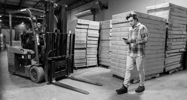 ¿Qué hay de malo en esta foto? Hay un trabajador caminando y usando su teléfono móvil sin prestar atención a lo que hay a su alrededor. Puede resultar gravemente herido por una carretilla elevadora en funcionamiento. Las lesiones por “caminar distraído” se han duplicado con creces desde 2004, y las encuestas han demostrado que el 60% de los peatones también se distraen con otras actividades mientras caminan.