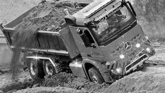 What’s wrong in this picture? This truck is about to roll over due to a bad steering wheel maneuver, and the ground where it is operating is too loose for the weight it is carrying.