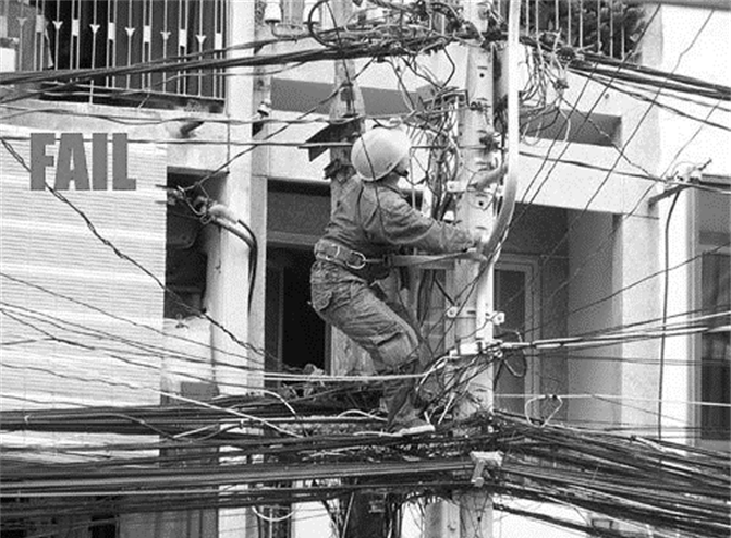 What’s wrong in this picture? There is an electrician working in direct contact with exposed electrical power lines.