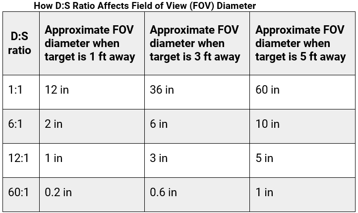 This chart below shows examples of the field of view diameter for different D:S ratios at different measurement distances.
