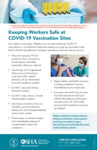 Your safety is important. Whether you are administering COVID-19 vaccinations in a traditional healthcare setting or a pop-up vaccination site, follow OSHA’s Bloodborne Pathogens standard to prevent sharps injuries:
