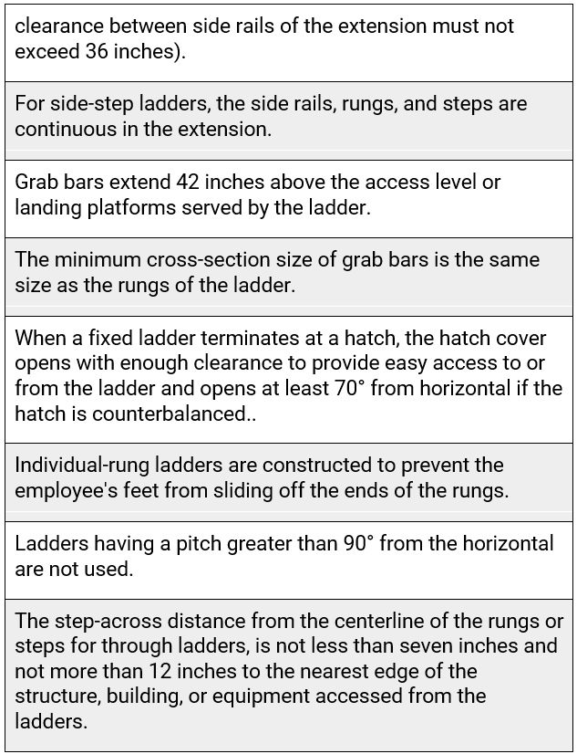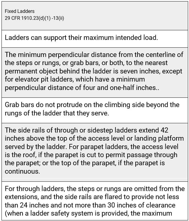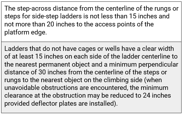 OSHA gets more granular with design requirements for specific types of fixed ladders above and beyond what’s specified under the General Requirements. Employers must ensure that: