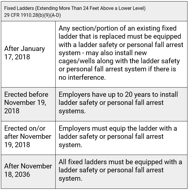 OSHA’s updated walking-working surfaces rule also addresses fixed ladders under 29 CFR 1910.28(b)(9), Duty to Have Fall Protection and Falling Object Protection. The rule phases in, over 20 years, a requirement to equip fixed ladders (that extend over 24 feet above a lower level) with ladder safety or personal fall arrest systems, and it prohibits the use of cages and wells as a means of fall protection after the phase-in deadlines. The rule grandfathers in cages and wells on existing ladders but requires that employers equip new ladders and replacement ladders/ladder sections with ladder safety or personal fall arrest systems during the phase-in period. Shown below are the established phase-in dates: