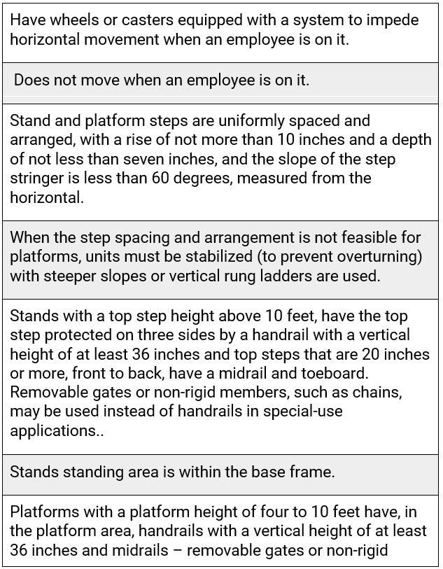 OSHA defines a mobile ladder stand as a mobile, fixed-height, self-supporting ladder that usually consists of wheels or casters on a rigid base and steps leading to a top step (29 CFR 1910.21(b)). A mobile ladder stand may also have handrails and is designed for use by one employee at a time. OSHA defines a mobile ladder stand platform as a mobile, fixed-height, self-supporting unit having one or more standing platforms that are provided with means of access or egress. Employers must ensure that: