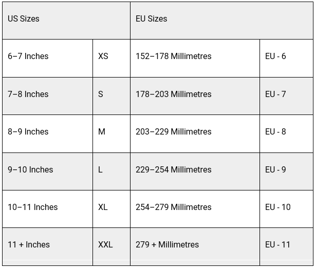 If the gloves you are purchasing come in numbered sizes, you can relate the measurement directly to the numerical size listed for the glove. For example, if the measurement taken is exactly eight inches (203 millimeters) then you would select a size eight glove. To avoid hand fatigue, order the next larger size for all measurements that are not exact inch/millimeter measurements. If the gloves you are purchasing come in extra-small (XS), small (S), medium (M), large (L), extra-large (XL) or double extra-large (XXL), use the table below to translate the inch/millimeter measurement.
