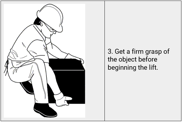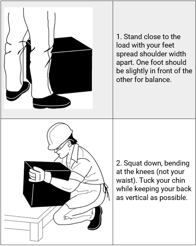 Before lifting, take a moment to think about what you are about to do. Examine the object for sharp corners, slippery spots or other potential hazards. Know your limit and do not try to exceed it. Ask for help if needed. Or if possible, divide the load to make it lighter. Know where you are going to set the item down and make sure the destination and your path are free of obstructions. Then follow these steps.