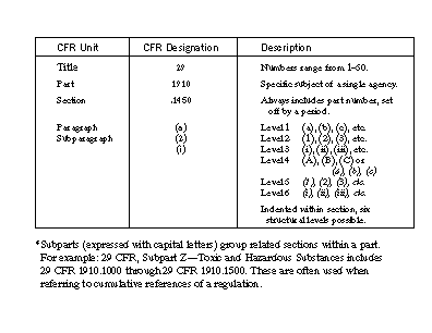Sometimes it requires a little research to obtain information from the CFRs. A typical OSHA reference may include the title, part, section, paragraph and sub-paragraph numbers. For example, 29 CFR 1910.1450(a)(2)(i), reads as Title 29, CFR, Part 1910, Section 1450, Paragraph (a), Subparagraph (2) (i). To help you better understand the organization of the CFRs, the following is an excerpt from 29 CFR 1910.1450: