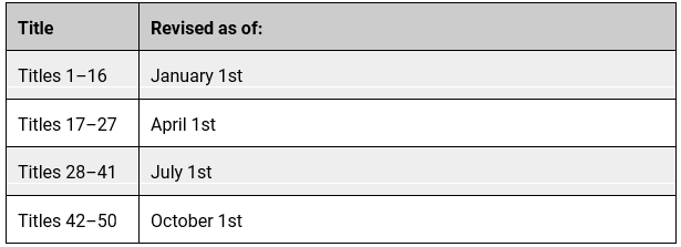 For quick reference, the color of the book covers changes annually. The revision date indicates when the revision is begun, and the CFR may not be available to the public for approximately six months after the revision date. The titles are revised and published annually by the following schedule: